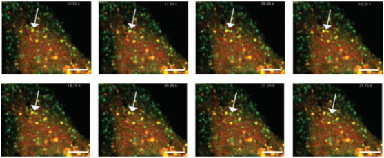 图2 观察蛋白质的膜输运过程需要快速的图像采集和高分辨率的成像方式。HeLa细胞中用CFP(绿色)和YFP(红色)标记的泡囊运动时间序列图像。63 x,1.4 NA物镜,4对图像/秒。箭头所指为膜的微管化过程和分裂过程。图中标尺:25μm。图像由英国布里斯托大学,Peter Cullen教授提供。 |