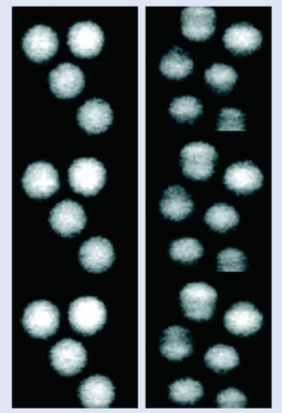 图3 用PerkinElmer独有的同步控制技术,以166帧/秒的速率采集的小球(3%荧光校正,Molecular Probes)连续图像。左:采用同步控制技术;右:未采用同步控制技术。右图中可看到从上而下的扫描线。 |