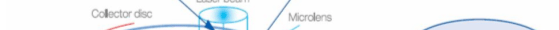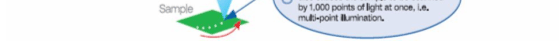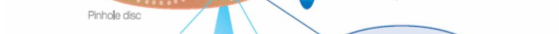 微透镜增强型的Nipkow转盘系统的核心,是在Nipkow双转盘中的一个转盘上,制作了20000个呈椭圆形分布的针孔。在同一时间,有1000个针孔可被激光照射。所以,被观察样本可被1000个小光束同时激发。在双转盘的另一个转盘上的微透镜,与上述的20000个针孔精准的对齐准直,并将激光光束聚焦到被观察的样本上,这种设计将激光光源的透射效率从1%提高到约60%。在高速旋转的速率下,1000个小光束可以1000帧/秒的速率扫描整个被观察的样本,即以1帧/毫秒的速率扫描被观察的样本。 |