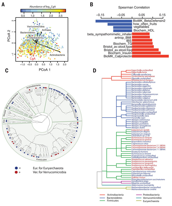 (C)基于170个种水平微生物的分类等级树,其中61种与CgA高度相关,红点代表正相关,蓝点代表负相关;