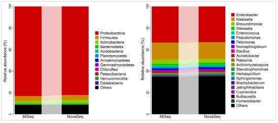 | MiSeq与NovaSeq细菌16S rRNA基因门和属水平物种相对丰度柱形图 |