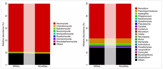 MiSeq与NovaSeq真菌ITS1基因门和属水平物种相对丰度柱形图 |