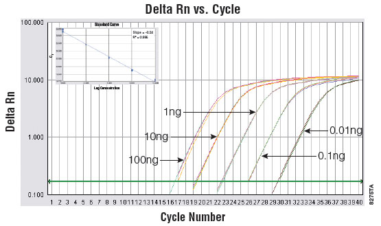 上图的模板为10倍系列稀释的人基因组DNA,扩增和检测的目的基因为GAPDH基因。