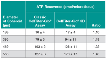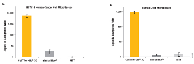 上图. CellTiter-Glo® 3D细胞活力检测试剂盒和alamarBlue法、MTT法细胞活力检测方法的检测结果。
