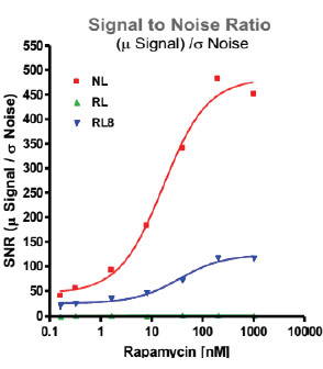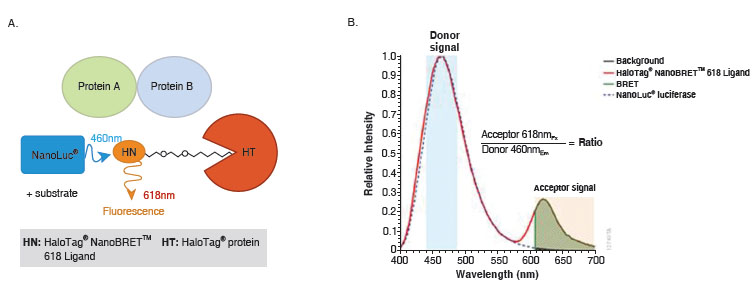 618 荧光基团作为受体。来自NanoLuc. 供体的明亮的蓝移发光信号耦合到远红移的 HaloTag. 受体上后,光谱叠加更佳、信号更强、且与传统BRET 分析相比背景更低。