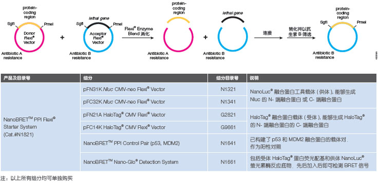 通过 Flexi. 载体克隆系统生成 Nluc 或HaloTag. 的 N- 端融合蛋白 — Flexi. 载体克隆系统生成一种定向克隆技术,基于两个稀有酶切位点的限制性内切酶, SgfI 和PmeI, 这种技术能够快速,高效,高保真性地在不同 Flexi. 载体间转移蛋白编码区,而无需重新测序。NanoBRET™ PPI Flexi. Starter System 提供了以Flexi. 载体系统为基础进行蛋白相互检测的解决方案,包括载体,检测试剂及阳性对照,配合Flexi. System, Entry/Transfer 或Carboxy Flexi. System, Transfer 即可完成实验。