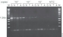 从人基因组DNA(Cat..# G3041)中扩增的α-1-胰岛素抗体基因的结果,该片段大小为1.2kb。G:GoTaq®Green Master Mix;N,T,A:其它商业化的Taq DNA聚合酶配方;M:桌面型1kb DNA Ladder (Cat..# G7541) ;NTC:无模板对照。