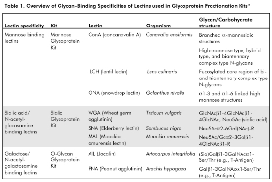 For 6 O-glycan glycoprotein preps: AIL and PNA Lectin Spin Columns (3 each); Buffers; Protease Inhibitor Solution; Collection Tubes (6 x 2 ml) |