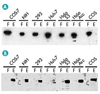 Protein-specific immunodetection of A unphosphorylated HSP-60 protein, and B phosphorylated p44 and p42 mitogen-activated protein kinase (MAPK) proteins. F: flow-through; E: eluate fractions. The antibody used to detect MAPK recognizes an epitope containing phosphorylated residues at Thr202 and Tyr204 in the p44 (upper band) and p42 (lower band) MAPK amino acid sequences. The absence of unphosphorylated HSP-60 in the eluate fraction and the absence of phosphorylated MAPK in the flow-through fraction demonstrate the complete separation of phosphorylated proteins using the PhosphoProtein Purification Kit.