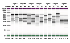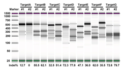mRNA,48小时后 riboEDIT™ T7EI Enzyme酶切检测靶位点的剪切效率,候选7个靶基因的剪切条带及编辑效率。如图所示,#1#2表示同一基因不同位点设计的2条crRNA。 |