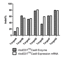 Fig.3 riboEDIT™ CRISPR-Cas9 mRNA基因编辑体系与riboEDIT™ Cas9 RNP复合物具有等同的靶位点编辑效率。 |