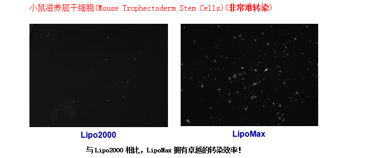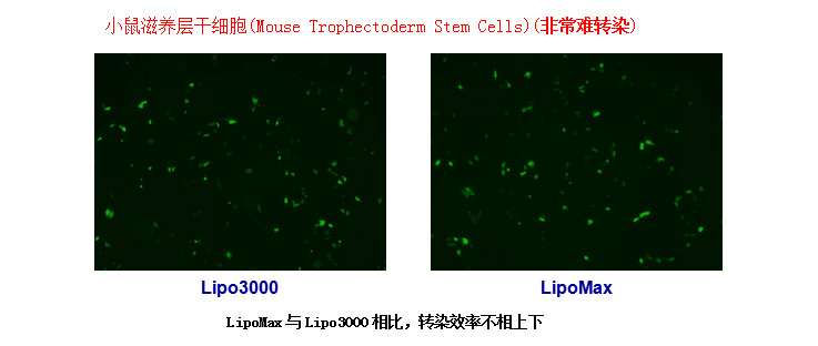 LipoMaxTM是一款新开发的高效低毒的真核细胞核酸转染专利试剂,在多种细胞中具有超高转染效率。DNA-LipoMaxTM复合体可直接加入细胞培养液中,有无血清均可。多数细胞转染后不必换液,少数敏感细胞可在转染后4-6小时换液去除DNA-LipoMaxTM复合体。LipoMaxTM转染试剂在HEK293和小鼠滋养层干细胞(TS)进行过大量的测试。LipoMaxTM转染试剂无微生物污染。