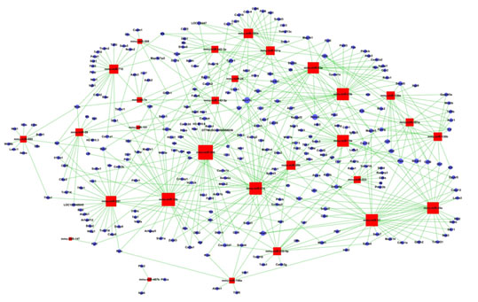 取差异MicroRNA及其调控的靶基因,基于两者之间的调控关系。通过表达谱的分析得到差异基因,并且与micrRNA的靶基因进行联合,从而得到靶基因中变化的基因。利用microRNA和具有差异的靶基因的属性关系,构建microRNA-Gene作用网络。而后,根据网络中microRNA的位置函数计算出microRNA在网络中的关系强度,即microRNA的网络特征值。特征值最高microRNA处于网络的枢纽性地位,该microRNA调控的基因数量最多,对网络结构和样本性状有重要的调控价值,同时从网络中也可以得到被microRNA调控的靶基因的调控情况,得到关键的靶基因。