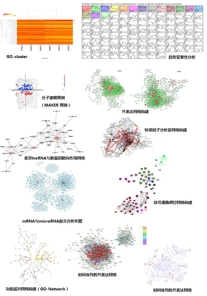 高级分析内容:功能层次网络构建(GO-Network)、GO Cluster、信号通路调控网络构建(Pathway-Network)、基因相互作用网络图、转录因子分析及网络构建、共表达网络构建(Coexpression Network)、时间序列的共表达网络、分子建模预测(MAKER 预测)、可变剪切分析、mRNA与lncRNA联合分析、miRNA的靶基因预测、miRNA的靶基因基因功能富集分析、miRNA的靶基因信号通路富集分析、miRNA与其靶基因的网络图展示(miRNA-target-network)、miRNA的靶基因功能调控网络图(miRNA-Pathway Network)、miRNA的靶基因功能调控网络图(miRNA-GO Network)、miRNA芯片结果与mRNA表达谱数据的共表达联合分析(需要有mRNA表达谱数据)、miRNA芯片结果与mRNA表达谱数据的靶基因负表达联合分析(需要有mRNA表达谱数据)