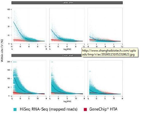 对于RNA-Seq,测序的深度以及表达水平都影响精确性;GeneChip® Human Transcriptome Array 2.0(HTA)无论转录本丰度高低均能提供精确的基因表达数据。
