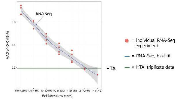 RNA- Seq 的准确性取决于测序深度。 GeneChip Human Transcriptome Array 2.0( HTA)提供了准确的结果 ,真准确性相当于2个Lane的RNA-Seq数据。