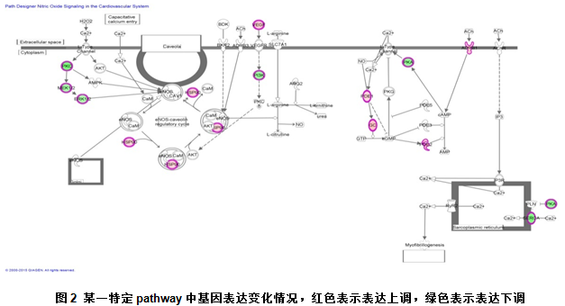 除了对所有差异基因进行全局的pathway分析,IPA还可以详细展示某一特定通路中特定基因的表达情况,从整体角度直观展示基因在通路中的变化情况。