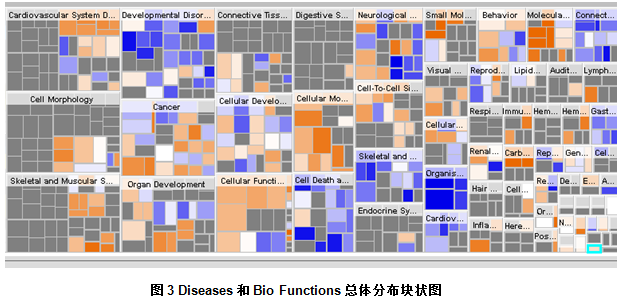 此分析通过IPA的Ingenuity® Knowledge Base数据库,进行Fisher精确检验,得到具有显著性意义的Diseases和Bio Functions(Bio Functions类似GO),从而可以得到特定实验数据的生物学趋势。通过该分析可以找到特定生物学功能的基因群,并预测该生物学功能的激活和抑制情况,为直接理解某种特定的生物学表型的内在原因提供详细数据。