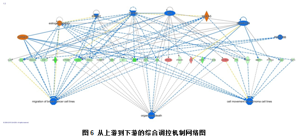 IPA的机制调控网络分析是根据转录因子抑制或者激活下游基因,进而影响某些生物学功能绘制调控机制网络图。该分析通过Consistency Score筛选出关键的信号转导调控机制。通过该分析,将上游转录因子调控,下游生物功能,基因互作调控等综合信息入手,绘制某种特定实验条件下的生物学调控机制crosstalk,从而可以在全局角度去理解复杂的调控网络机制。