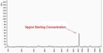 | 不同比例的异源核酸:同源核酸DNA样品突变检测结果。结果显示,在1:24混合比例下系统仍有检测信号,保证了DNA样品检测的高通量 |