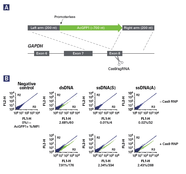 图A 采用Guide-it™ Long ssDNA Production System 制备长ssDNA供体模板,所设计的HDR供体模板的同源臂序列为GAPDH外显子8的末端序列,AcGFP1与 GAPDH处于同一阅读框。