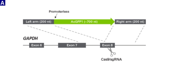 图1. 在HEK293细胞的GAPDH的C-末端定点敲入AcGFP1基因。