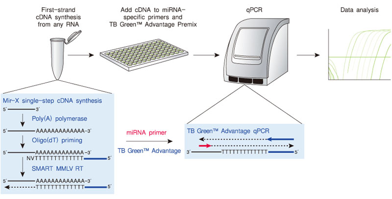 Mir-X™ miRNA qRT-PCR TB Green™ Kit的原理是在单管中一步法合成第一链cDNA,然后使用miRNA特异性引物和TB Green™试剂对cDNA进行特异性的定量扩增。 在Mir-X cDNA合成反应中,使用poly(A)聚合酶将RNA加A尾,然后使用修饰的oligo(dT)引物和SMART MMLV Reverse Transcriptase进行反转录。