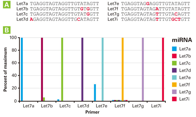 对Let7 miRNA家族序列进行特异性的定量检测。将合成的8种Let7家族序列混入yeast poly(A)+ RNA中作为模板,使用图A中的8条引物进行检测。将每个特异性引物的定量值取为100时,显示数值如图B所示,除了对应引物的扩增,几乎没有脱靶的扩增。