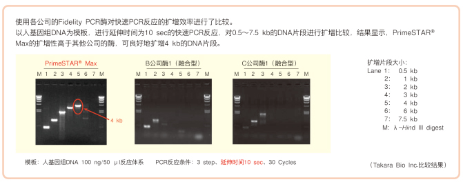 PrimeSTAR®系列具有很强的3'→5'外切酶活性,保真性优于Takara Bio的其他任一种PCR酶。此外,该酶兼具很高的反应性能,可谓是克隆用PCR酶的理想选择。