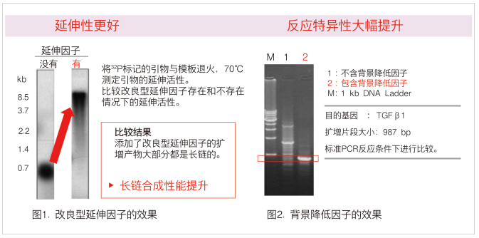 通过对α型聚合酶进行改良、抑制了酶自身对于DNA模板的非特异性扩增以及过剩结合。 此外,通过添加改良型延伸因子,使得DNA合成能够连续顺畅的进行,从而提高反应性能。增加延伸性、能够稳定的获得足够长度的扩增产物。(图1)