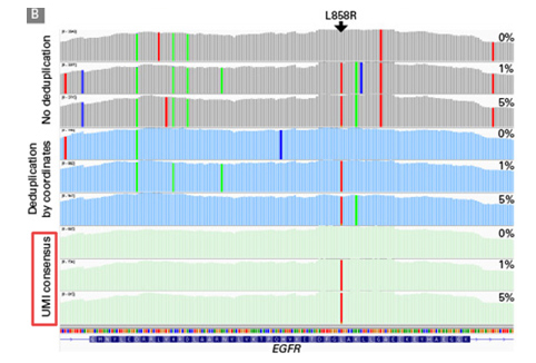 同时,为了比较UMI与常规使用的坐标法之间的效果差异,Takara科学家先使用未去重或者仅用坐标法去重的文件分析,在预期的EGFR L858R突变附近观察到大量的低频及随机等位基因频率突变。而随后用UMI校正、过滤数据后,清除了假阳性突变,得到了预期的突变分析结果!