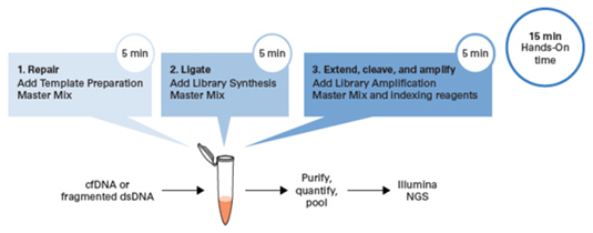 对标1:ThruPLEX Tag-Seq HV这款试剂盒支持单管、三步操作,手动15 min,全程2 h,无需在建库过程中转管或纯化。
