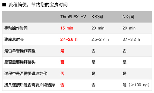 我们比较了ThruPLEX HV和K、N两家公司的试剂盒,只有ThruPLEX是单管操作、时间最短、操作最便捷的系统。