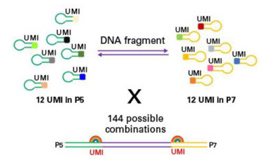 ThruPLEX Tag-Seq HV茎环形接头上还包含7位碱基的固定型UMI,双端总共可有144种UMI连接到DNA分子两端,以识别一致序列,减少扩增或者测序错误带来的假阳性突变。 |