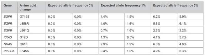 Takara科学家采用ThruPLEX Tag-Seq HV对10 ng起始的Quan-Plex Patient-Like ctDNA标准品(AccuRef)构建文库,肿瘤相关的基因采用IDT xGEN Pan Cancer Panel进行捕获富集,随后用UMIs鉴定了ctDNA标准品中特定位点的实际突变频率。结果显示,检测到的突变频率分别与预期1%、5%的等位突变频率接近,而阴性对照组没有在位点处检测到任何突变。 |