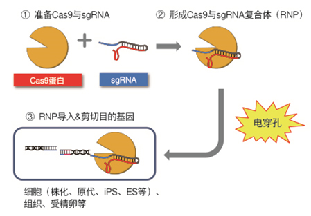 - 与单向导RNA(sgRNA)形成RNP复合物,可通过电穿孔或者显微注射方式导入