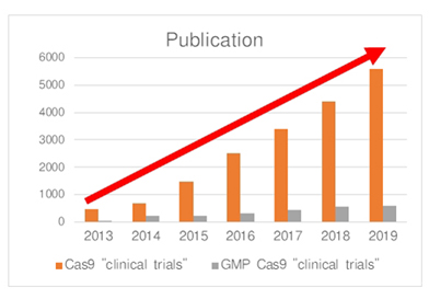 Google Scholar检索结果显示,使用RNP进行基因编辑的文章,我们发现无论使用哪种导入法(电穿孔、显微注射、转染),相关文章数量都在逐年增加;以Cas9 “clinical trials”为关键词进行检索,发表文章逐年上升,2019年发表文章数量已超过5,000篇;以GMP Cas9 “clinical trials”为关键词进行检索,发表文献相对较少,但也呈现逐年上升的趋势。