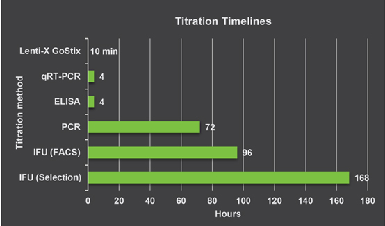 上图比较了用Lenti-X-GoStix Plus和几种常用经典方法,测定慢病毒滴度所需要的时间(以小时为单位)。在这些检测方法中,使用Lenti-X-GoStix Plus进行检测耗时最短。①Lenti-X-GoStix:本文所介绍的基于侧向层析检测技术的慢病毒上清液中p24的检测方法;②qRT-PCR:通过qRT-PCR定量测定病毒RNA基因组;③ELISA:测定慢病毒衣壳蛋白质p24的含量;④PCR:通过qPCR检测整合DNA前病毒;⑤IFU(FACS):通过流式细胞仪分析RFP(红色荧光蛋白质)/GFP(绿色荧光蛋白质)阳性细胞确定感染细胞占总细胞数的百分比;⑥IFU(筛选):通过量化感染细胞群中耐药细胞克隆的数量来确定感染单位。