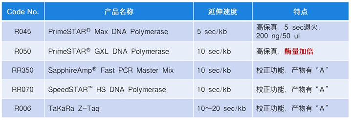 普通Taq酶的延伸速度一般为1 min/kb,Takara高速高保真的明星产品PrimeSTAR Max可以做到5 sec/kb。此外,Takara的PCR酶制品种类丰富,拥有不同种类及扩增性能的高速PCR酶,如下表所示: