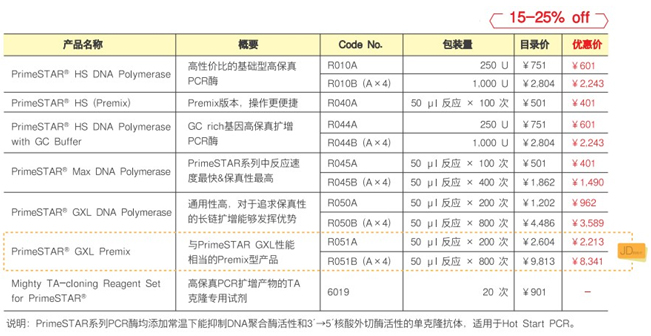 秋促期间,R051 PrimeSTAR® GXL Premix高保真酶85折促销+买赠50/200元京东卡活动火热进行中,多买多送,上不封顶;其余PrimeSTAR系列产品8折促销,畅销品R045 PrimeSTAR® Max DNA Polymerase单次反应价格低至4元/50 ul反应体系。
