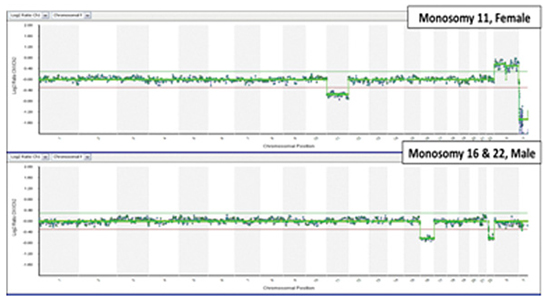 利用单卵裂球活体组织检查样品进行PicoPLEX WGA Kit扩増标记后,与24 sure array杂交,结果清晰地显示了CNV(上图)。2011年ESHRE(欧洲人类生殖与胚胎学会)的临床实验证明了采用PicoPLEX 技术进行人类染色体核型分析的准确性。