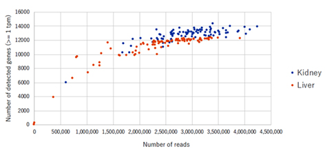 东京大学新领域创成科学研究科的关先生团队使用SMART-Seq® Single Cell Kit进行细胞块的RNA-Seq研究。本次实验,首先将直径约为150-200μm的小细胞块(小鼠肾脏和肝脏)分选到384孔板中并进行裂解。之后将其中一部分转移到96孔板中,在自动化移液系统dragonfly discovery(SPT Labtech)上运行SMART-Seq® Single Cell Kit(1/4体积用量)制备cDNA,再使用Nextera XT DNA制备测序文库,并在NovaSeq 6000(Illumina)上进行测序分析。
