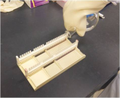 ⑤ 倒胶:将琼脂糖溶液倒入制胶模中,然后在适当位置处插上梳子。凝胶厚度一般在 3-5 mm 之间。