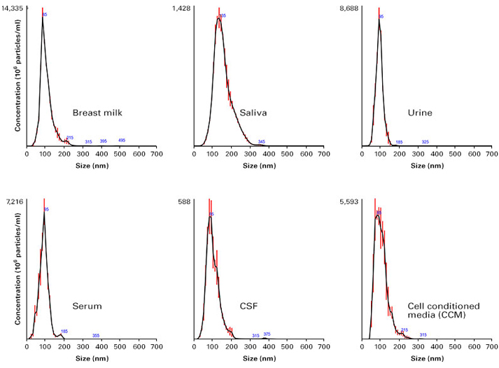 | Capturem™ EV提取试剂盒成功的从不同生物体液样品中提取EVs。上图NTA结果显示,本制品可以应用于多种生物体液样品的EVs提取,如母乳、唾液、脑脊液、血清、尿液、条件培养基。每种方法的粒径分布计算以平均值(黑线)和标准误差(红线)显示。 |