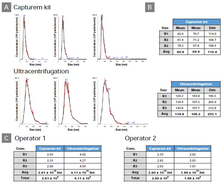 与超速离心法相比,Capturem™ EV提取试剂盒分离得到的EVs浓度和纯度更高且误差更小。分别使用本制品和超速离心法从500 μl血浆样品中分离EVs,进行三次重复性实验,使用Nanoparticle tracking analysis (NTA) 检测。本制品提取的EVs平均粒径大小为81 nm(D90=110 nm),超速离心法提取的EVs平均粒径大小为135 nm(D90=203 nm)。且由两位不同的操作人员使用本制品所得EVs收量误差很小,而使用超速离心法收量变化较大。 |