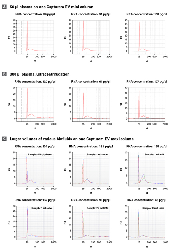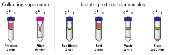 - 快速、重复性好——30 min内即可从最高850 μl(Mini)或24 ml(Maxi)生物体液样品中快速提取EVs,不同操作者也可获得具有重复性的EVs收量