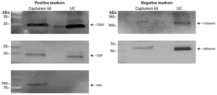 - 纯度高——提取的EVs经Western Blot检测表达exosome蛋白质,而不表达nonexosomal污染蛋白质,如calnexin和 albumin