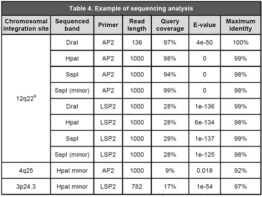 提取慢病毒整合后的HT1080细胞基因组DNA,使用DraI、SspI、HpaI这3种不同的平末端切割限制酶酶切消化基因组DNA并连接接头,构建出3个病毒整合文库。这3个病毒整合文库经过两轮PCR扩增后,对获得的5个扩增产物进行纯化,并分别使用试剂盒中包含的AP2和LSP2接头引物测序和BLAST软件分析。分析结果显示,其中4个PCR产物对应的整合位点为染色体12q22。染色体12q22上的病毒整合位点位于NR2C1基因的内含子内。