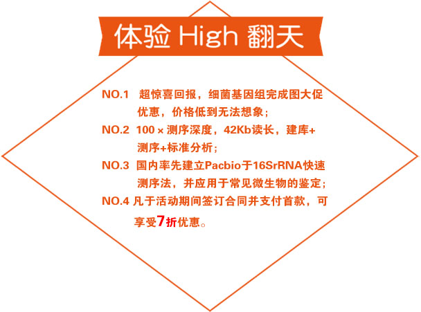 2013年天津生物芯片国内率先提供PacBio RS II三代测序服务,天津生物芯片已积累丰富的项目经验,目前应用该平台产出的各项结果均在国内遥遥领先。其中,测序读长可达42Kb,reads N50高达18Kb,每个SMRT Cell的数据量最高达1.4Gb。为庆祝天津生物芯片Pacbio测序项目突破5000个SMRT Cell ,特在2016年开年为合作伙伴送惊喜,体验High翻天!