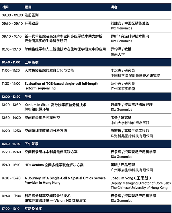 在这一天的活动中,您将沉浸在技术交流和学术创想中,听各领域科学家分享他们开创性的研究项目。同时,您可以与10x的技术专家交流,了解最新的 GEM-X 单细胞、Visium HD 及 Xenium 原位技术,并深入了解从样本制备到数据分析的单细胞和空间解决方案。您还可以借此机会与不同研究领域的研究人员建立联系、分享想法,推动创新合作。